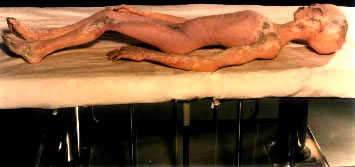 This photograph is from an alleged alien autopsy. The film, which shows the entire autopsy being done on the alien, was supposidly shot in 1947, after the UFO crashed down in Roswell, New Mexico, USA. This film was not done as it should have been if it really was filmed at a military base. The military would have filmed this event with more organization and care. The video however was not organized and at times the camera man had to crawl over the doctors to get a better angle. If an alien were to be found the autopsy would take months, carefully examining all the parts of the body under microscope etc. The film shows the autopsy for an hour or two.